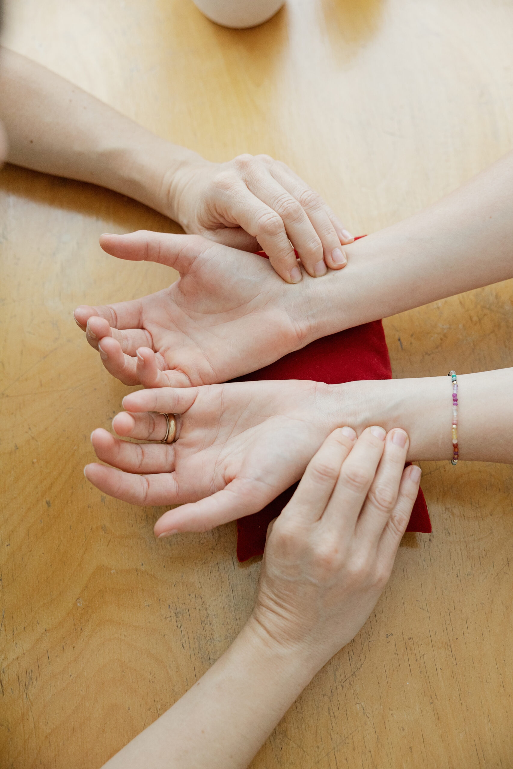 Der Puls wird an beiden Handgelenken auf drei verschiedenen Positionen sowie auf drei Ebenen getastet. Es werden Aspekte wie Tiefe, Geschwindigkeit, Stärke und Qualität berücksichtigt.
